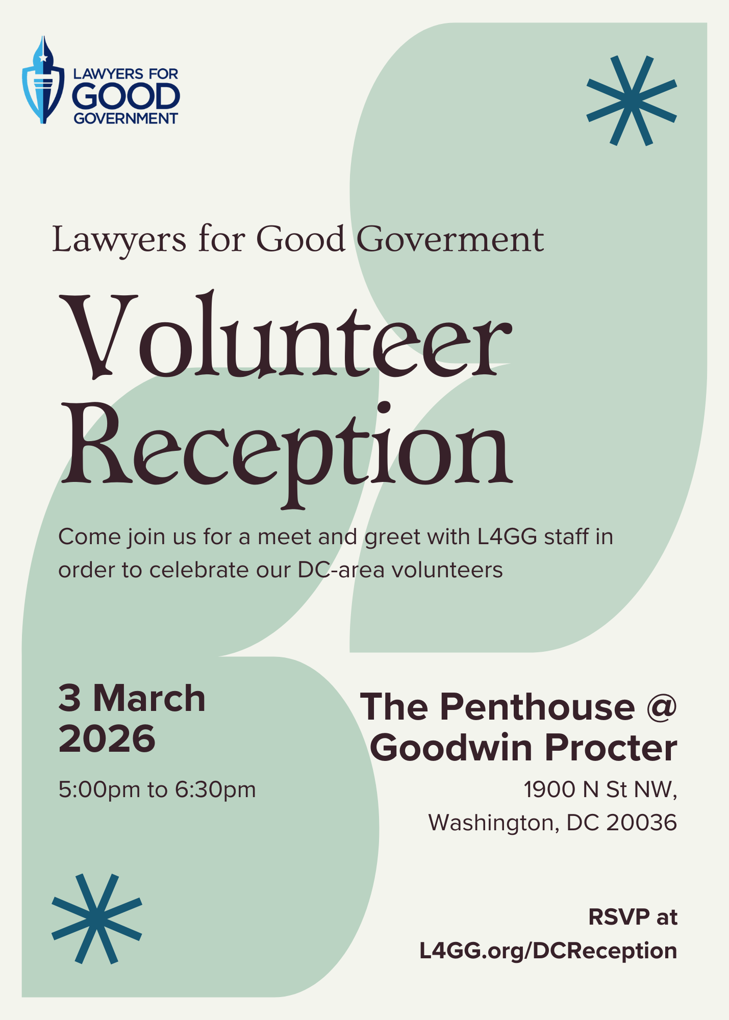 Join Lawyers for Good Government staff in Washington, D.C. on Tuesday, March 3, 2026 for a volunteer reception. We will gather for a meet and greet with short remarks and light fare from 5-6:30pm at the Penthouse at the offices of Goodwin Procter, located at 1900 N Street NW.